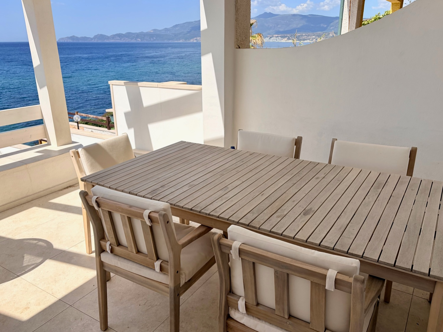 Auf der großen Terrasse kann man es sich im Lounge-Bereich mit einem Sundowner gemütlich machen oder an der langen Tafel in großer Runde essen. Auf der weiter unten gelegenen Terrasse steht eine Sonnenliege bereit. Vom Balkon aus genießt man einen 180 Grad Panoramablick auf die Küste und in den Sternenhimmel.